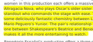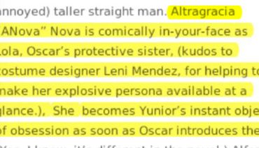 The NY Times published that Marco Antonio Rodríguez’s script for The Brief Wondrous Life of Oscar Wao play is witty, and the play is culturally specific. A fusion of melancholy with comedic precision, and lends the opportunity to introduce a cohort of confident Latino actors to take center stage. The cast of seven, transcend the audience to a past that still reverberates strongly today with many Dominicans. Each actor breathes life to their characters, making them tangible and three dimensional. The realism of the language and cultural quirks are tastefully integrated with each role.
